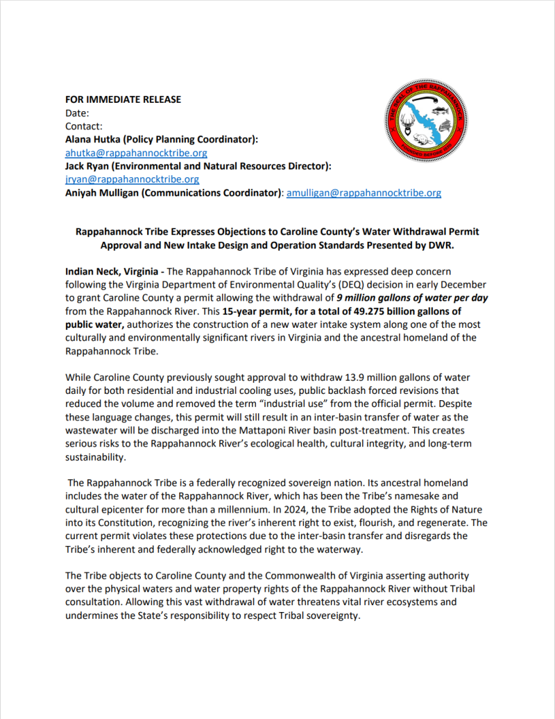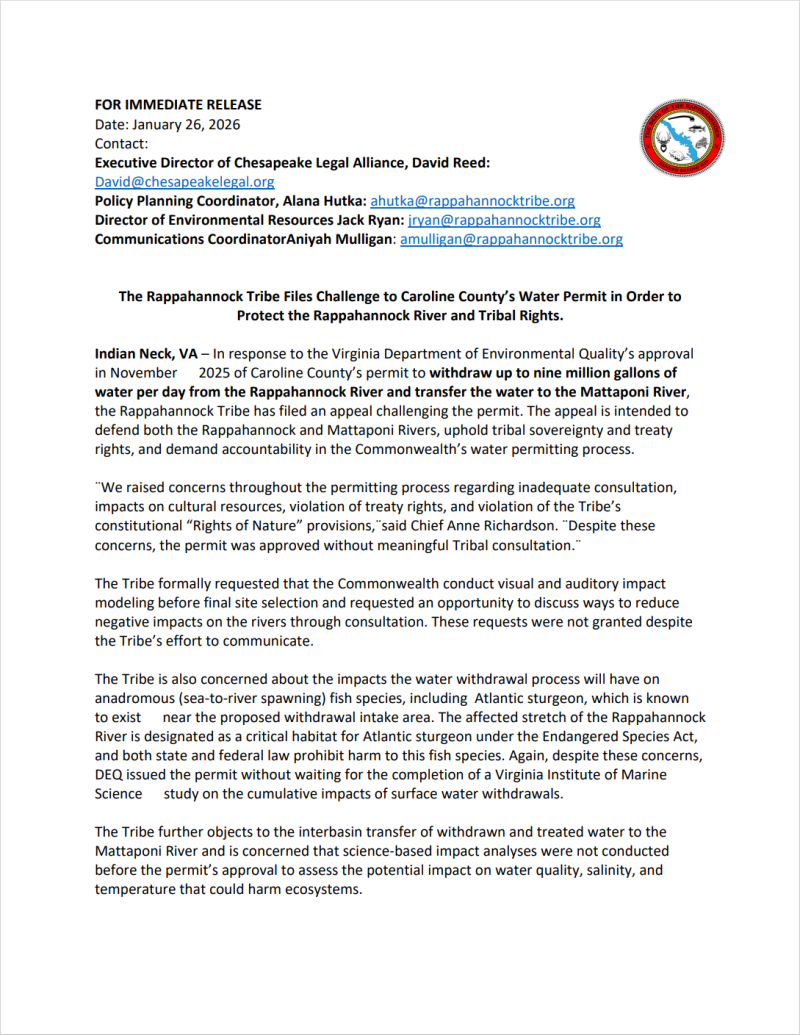 The Tribe is challenging DEQ’s approval of Caroline County’s permit to withdraw up to nine million gallons of water per day from the Rappahannock River and transfer water to the Mattaponi River, arguing that the permit was issued without required consultation or adequate scientific analysis.